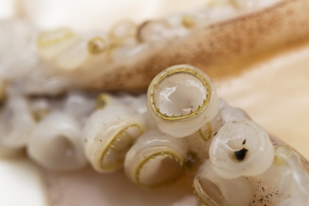 イカの歯は口だけではなく、吸盤にも付いています。「角質環(かくしつかん)」と呼ばれるギザギザとした硬い歯のようなリングが付いており、獲物をギザギザ部分に引っ掛けて捕まえます。