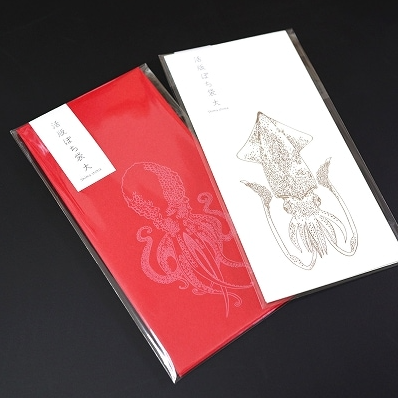 リアルに描かれたイカとタコが印象的な大きめのポチ袋です。紙幣を折らずに入れられる他、ちょっとした手紙を入れるのにも便利です。